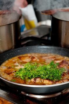 Ehhez lila hagymát érdemes vékony szeletekre vágni, amire jó nagy csomag összeszabdalt petrezselymet szórunk. Pici só, bors kerül rá, és 2-3 gerezd fokhagymát reszelünk bele. Az egészet meglocsoljuk kis tárkonyecettel, és összeforgatjuk a friss meleg libatöpörtyűvel.